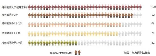 根據(jù)投資時(shí)報(bào)2020年6月的數(shù)據(jù),從國(guó)內(nèi)全部權(quán)益類公募基金平均來(lái)看,如果持有三年每100人中大概有85人能夠?qū)崿F(xiàn)正收益。而以東方阿爾法精選混合基金為例,任一時(shí)間點(diǎn)買入并持有兩年均可以實(shí)現(xiàn)所有人均盈利,即盈利客戶的比例是100%。相反,如果持有基金時(shí)間變短,每100人的盈利人數(shù)會(huì)逐步下降。(詳細(xì)情況請(qǐng)參閱上一篇文章)