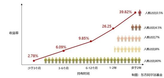 如下圖所示,以東方阿爾法精選混合基金為例,持有時(shí)間越長(zhǎng),基金持有人的平均收益水平越高。